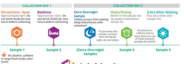 - While adhering to your most common wake/sleep schedule, collect as close as possible to the below timeline. No Alcohol, Caffeine or Large Fluid Intake after lunch before collecting the dinner sample. No more than one cup of fluids between Samples #3 and #4.