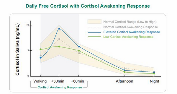 Even though a patient may have “normal” free cortisol levels throughout the day, that doesn’t always mean everything is functioning properly. The graph below shows two good examples. A blunted or exaggerated Cortisol Awakening Response (CAR) can appear, even when single samples return “normal” results. The HPA axis might not be appropriately responding when faced with a stressor, even when cortisol levels are fluctuating nicely throughout the day. The “stress” of waking allows us to test the HPA axis in a way that has been independently correlated to clinical outcomes and cannot be assessed by other cortisol tests on the market.